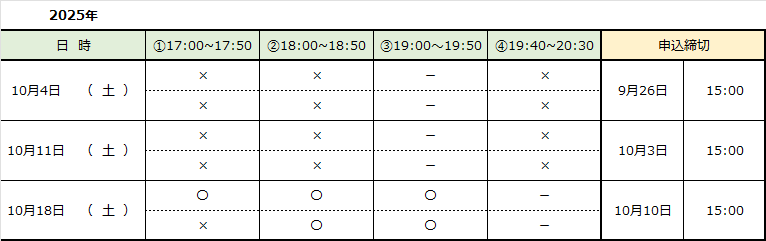 1回目・2回目 17:00~17:50、18:00~18:50、19:40~20:30